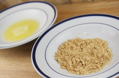 Bước 1: - Đầu tiên, bạn cho bánh quy đã nghiền mịn và bơ vào 2 chiếc đĩa khác nhau rồi để sẵn sàng. |