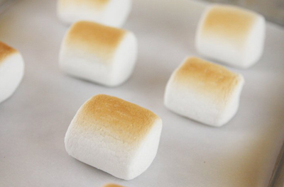 Bước 5: - Nếu nhà có lò nướng, bạn xếp kẹo marshmallow ra khay có trải giấy nến rồi nướng ở 160 độ C cho đến khi kẹo hơi sém nâu mặt trên. - Nếu nhà không có lò nướng, bạn có thể cắm kẹo vào que dài rồi nướng trên lửa bếp, đến khi kẹo cũng vừa sém là được. |