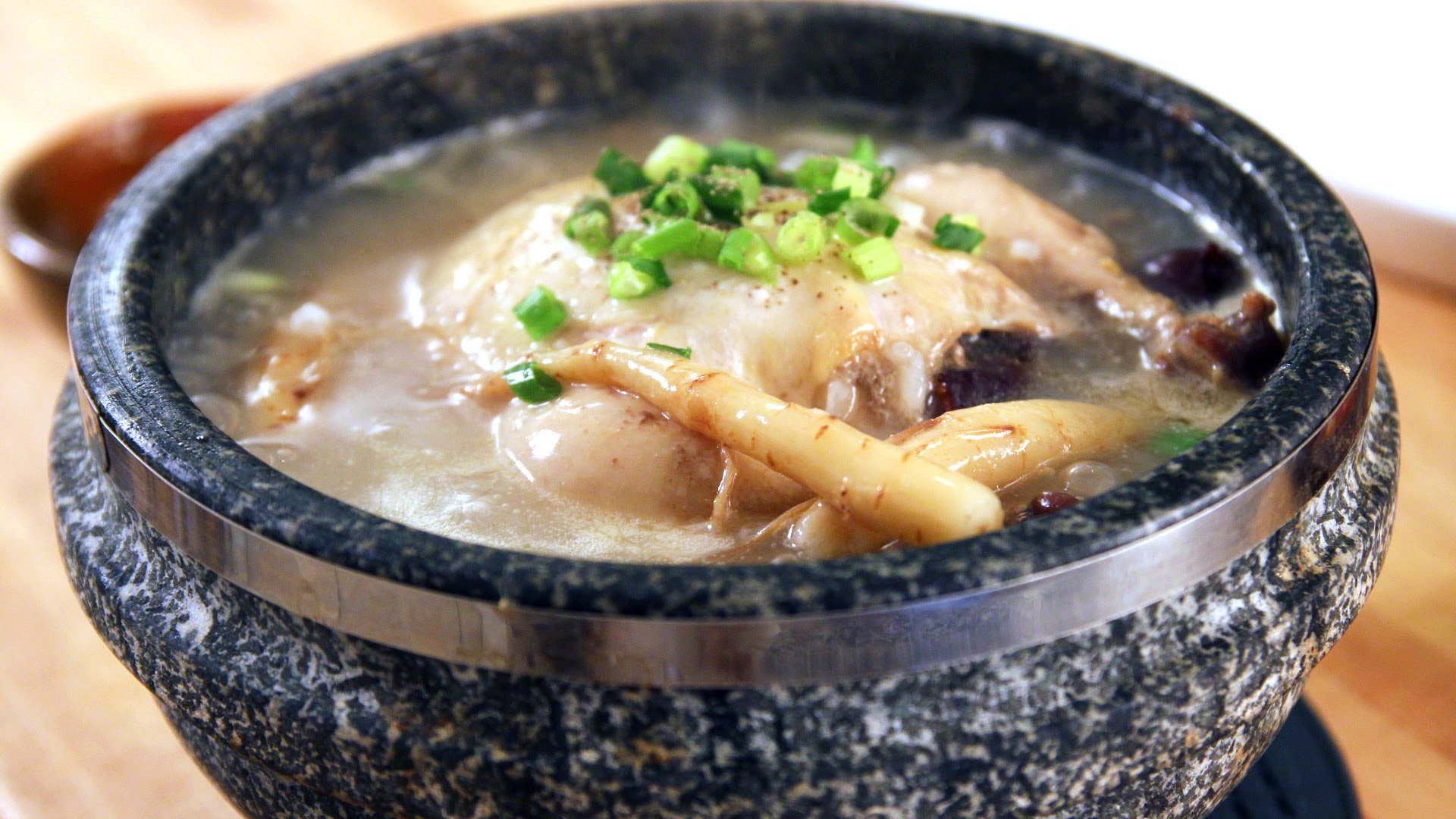 Đây là tên gọi của món gà tần sâm Hàn Quốc. Trong lịch của người Hàn có ba ngày nóng nhất trong năm gọi là Chobok, Jungbok, Malbok. Trong những ngày nóng như đổ lửa đó, món ăn được nhiều gia đình chế biến nhất chính là samgyetang. Gà được làm sạch, nhồi sâm cùng gạo nếp và các vị thuốc bắc rồi khâu lại bằng chỉ, hầm trong nhiều giờ liền. Món ăn giúp giải nhiệt, thanh mát cơ thể hiệu quả. Ở những nhà hàng samgyetang nổi tiếng, món ăn này còn được dọ kèm với rượu sâm.